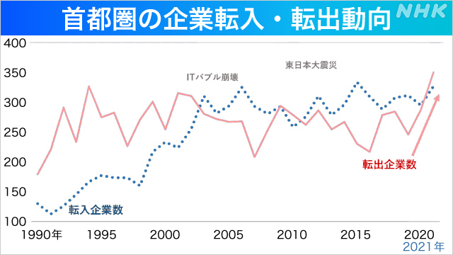 According to a survey by Teikoku Databank and reported on by NHK, 351 companies moved their headquarters or head office functions from the Tokyo metropolitan area to regional areas in 2021, the highest number since 1990, when the data was first collected.